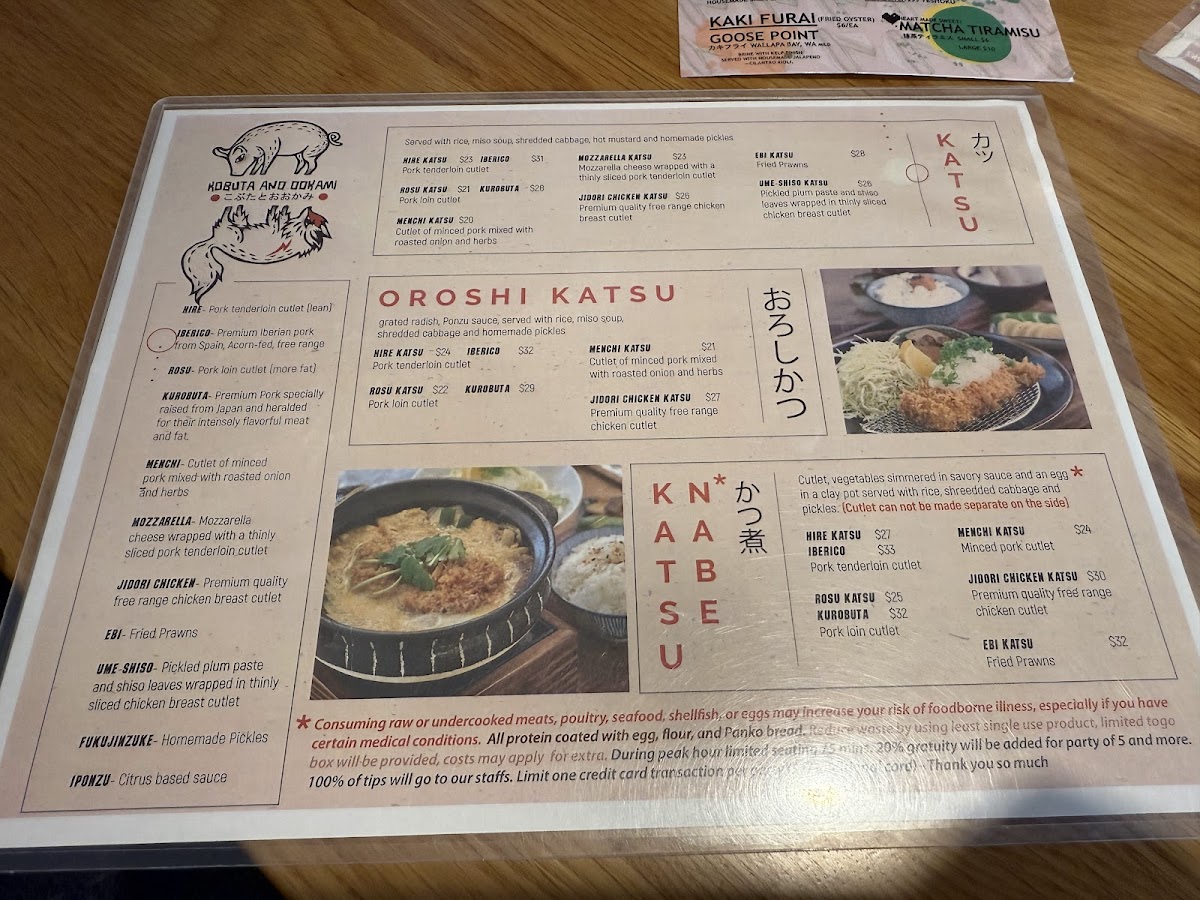 From a reviewer’s perspective, the menu at Kobuta & Ookami Katsu And Sake House, located at 17026 Avondale Way STE A, Redmond, WA 98052, presents a focused yet thoughtfully layered exploration of Japanese katsu culture. As a conclusion to the menu experience, what stands out most is the restaurant’s commitment to variety within a clear theme: premium cuts, careful preparation, and multiple flavor profiles built around katsu. The Add On Side selections-Hire, Kurobuta, RosuEbi, and Rice-allow diners to customize their meals, reinforcing a sense of balance and completeness in every order.